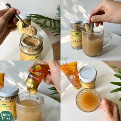 > ตัก 1 ช้อนชา หรือ ครึ่ง ช้อนชา ตามชอบ ต่อน้ำอุ่น 1 แก้ว