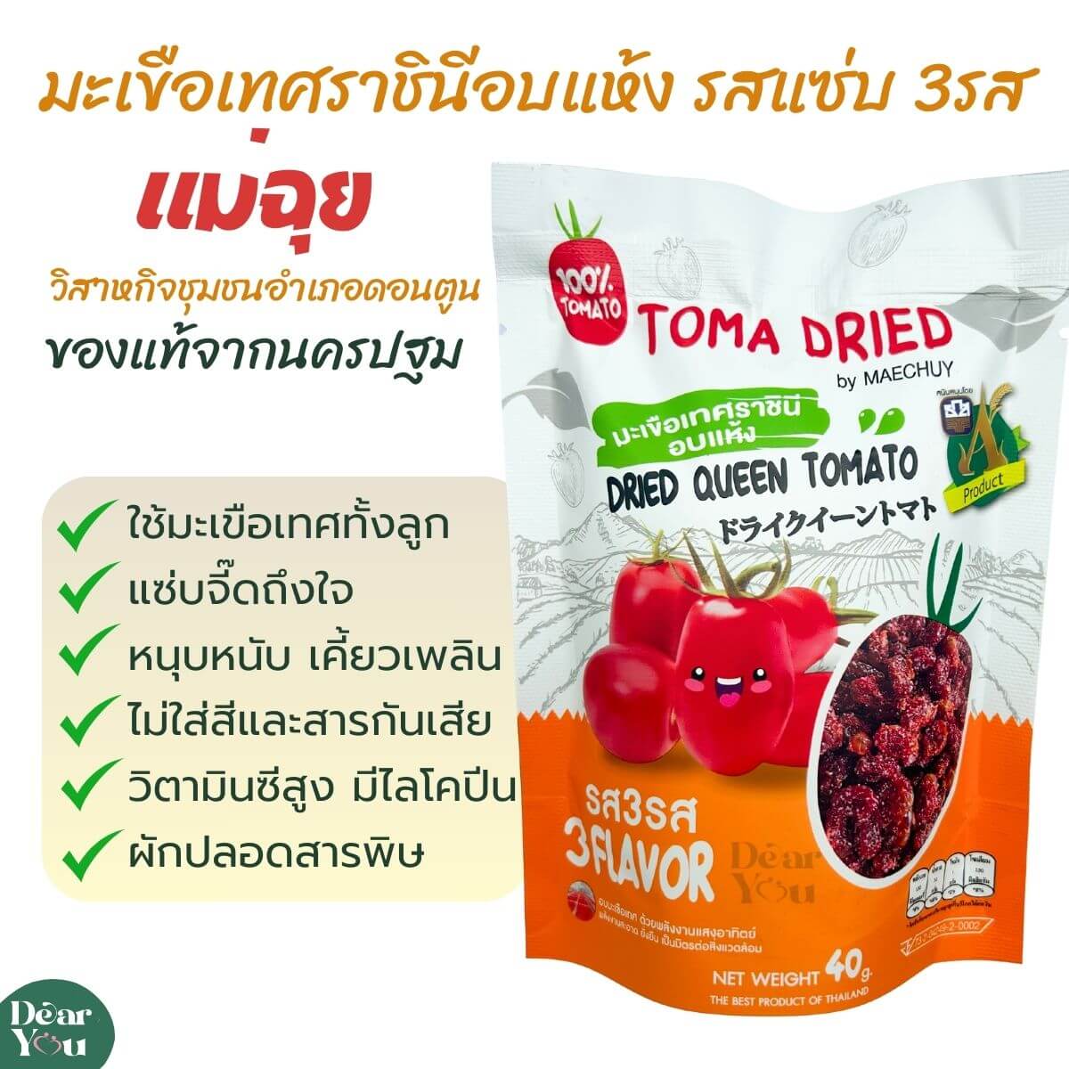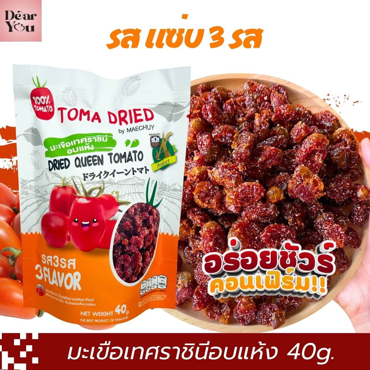 มะเขือเทศราชินีอบแห้ง รสแซ่บ 3 รส แม่ฉุย แปลงปลอดสาร 100% เนื้อล้วน ครบรส แซ่บ หนุบหนับ
