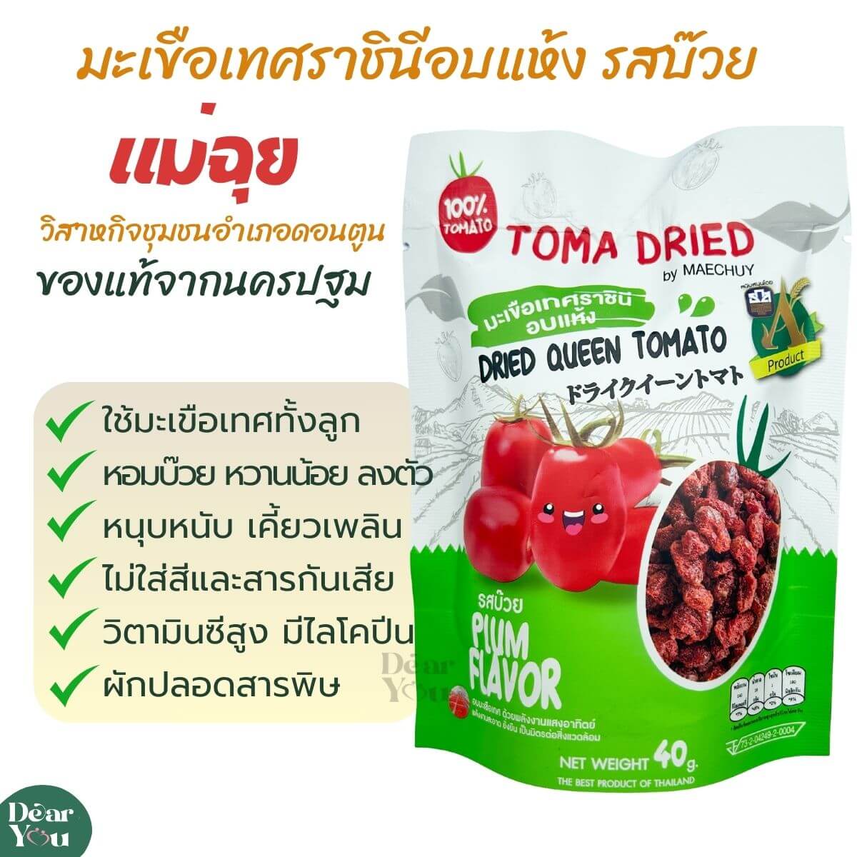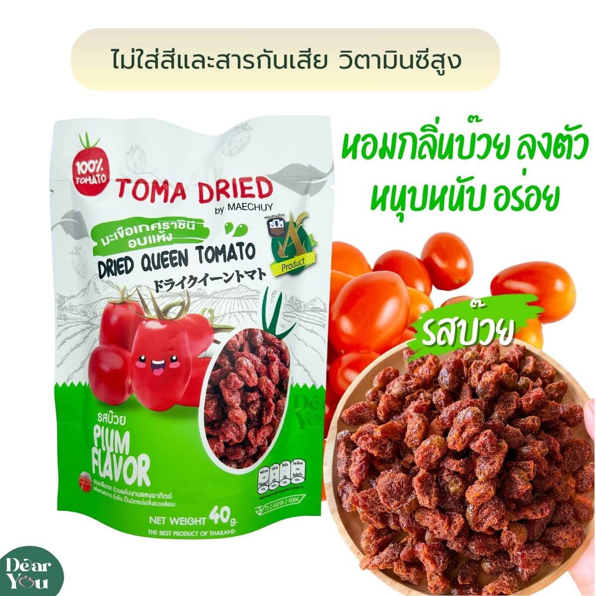 มะเขือเทศราชินีอบแห้ง รสบ๊วย แม่ฉุย แปลงปลอดสาร 100% เนื้อล้วน หอมบ๊วย หวานน้อย หนุบหนับ